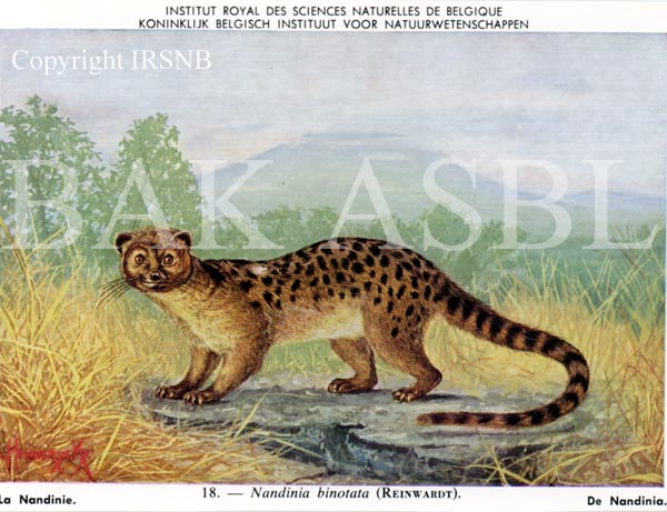 La nandinie mesure environ 100 cm de long (dont 50 cm pour la queue) et pèse environ 2 kg. Ses pattes sont courtes et munies de griffes pointues. Sa tête est arrondie. Son pelage laineux beige gris et teinté de châtain est marqué de points foncés disposés en rangs. Deux taches de couleur crème sont présentes sur les épaules. Son ventre est grisâtre. Sa queue est longue et marquée de 12 anneaux noirs. |