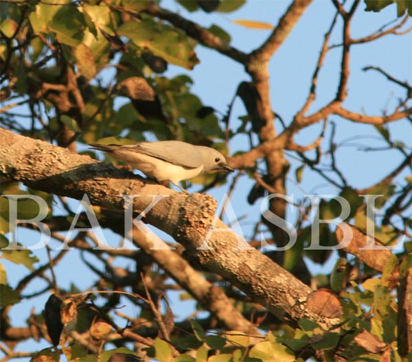 L’échenilleur à gorge blanche se distingue par son ventre blanc. Le reste du corps est gris. |