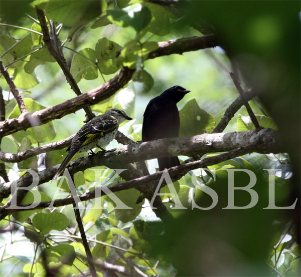 Voici un oiseau au dimorphisme sexuel bien marqué. Le mâle est entièrement noir avec des épaulettes jaunes (parfois absentes) . Les femelles sont brunes et jaunes avec le dessous blanc barré de petits traits noirs. Le mâle ne peut être confondu avec un drongo car sa queue est droite. De plus il ne perche pas à l’affût d’insectes mais au contraire se déplace sans cesse dans la canopée. |
